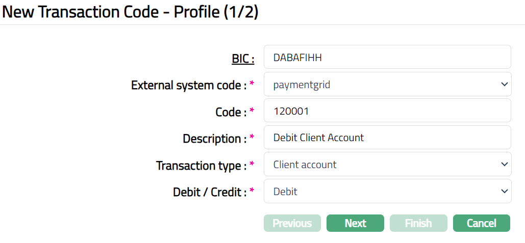 Enter transaction Code which is maintained in the external system to which the adjustment entries will be posted. This is a unique alphanumeric code. If you enter an existing external system code, BIC and code combination, then CC-PG will display an error message as Combination already exists.