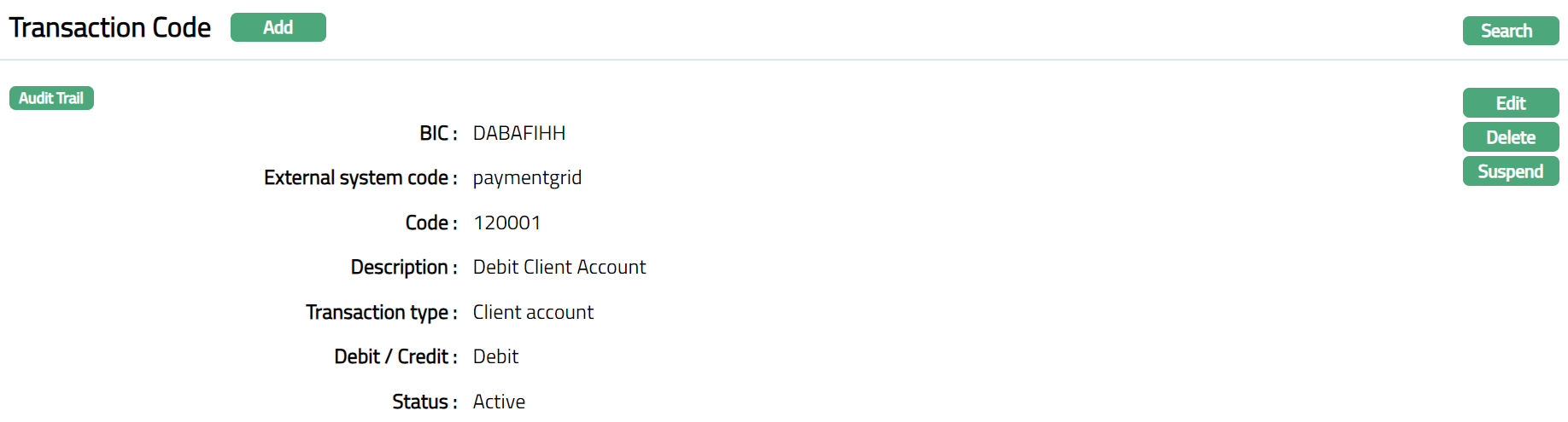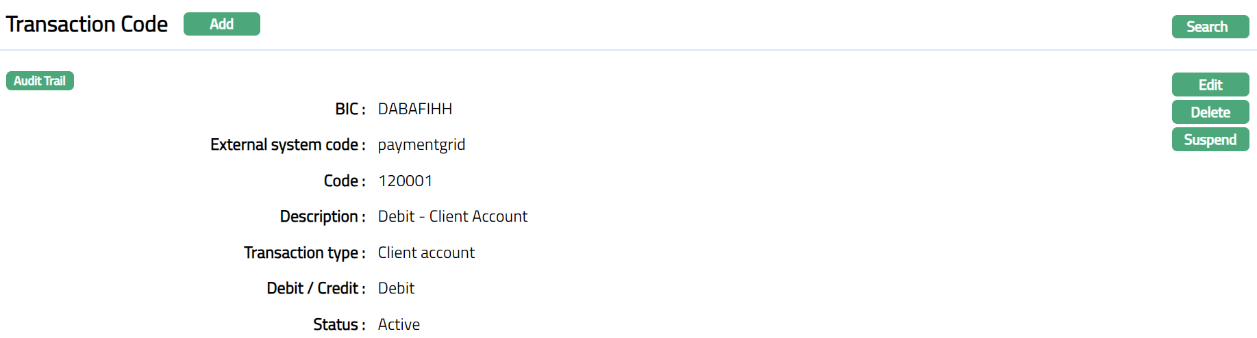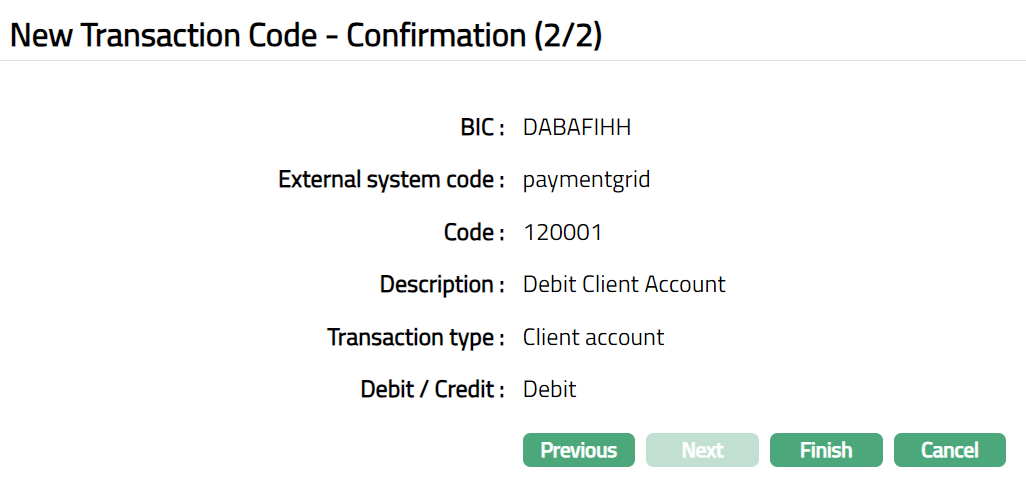 - Click Finish. Transaction Code page appears. Transaction code Status will be displayed as Active.