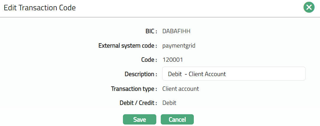 Specify whether the Transaction code is for a debit or credit type transaction in the Debit / Credit drop-down field.