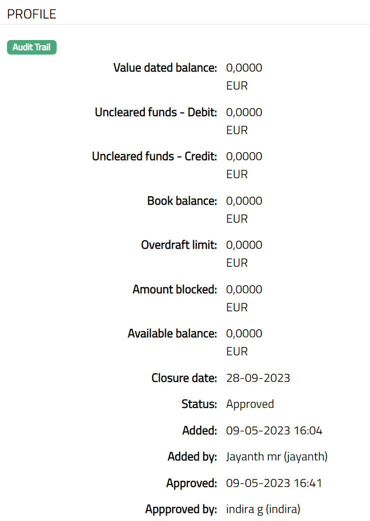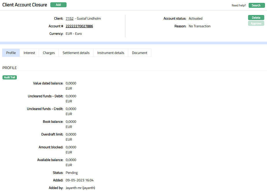 Profile tab, which is the default tab in Client Account Closure screen, shows the basic details of the account closure record created for an account.