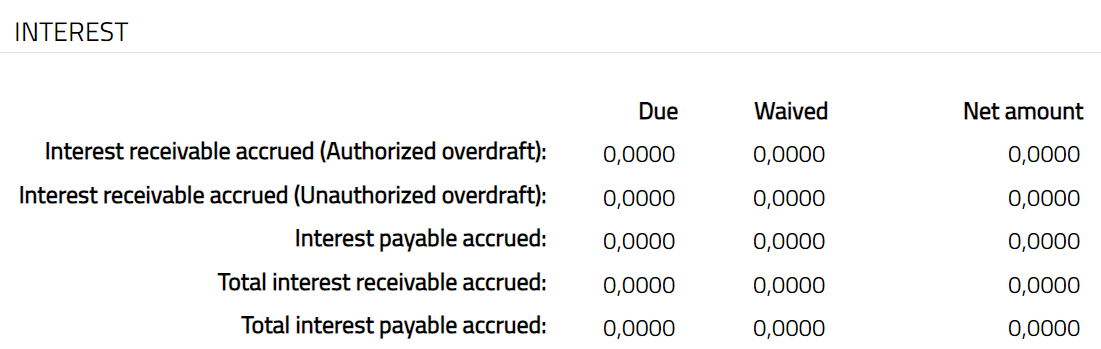 Interest receivable accrued (Unauthorized overdraft) denotes the interest receivable accrued for an unauthorized overdraft. This will be zero if there is no interest receivable accrual.
