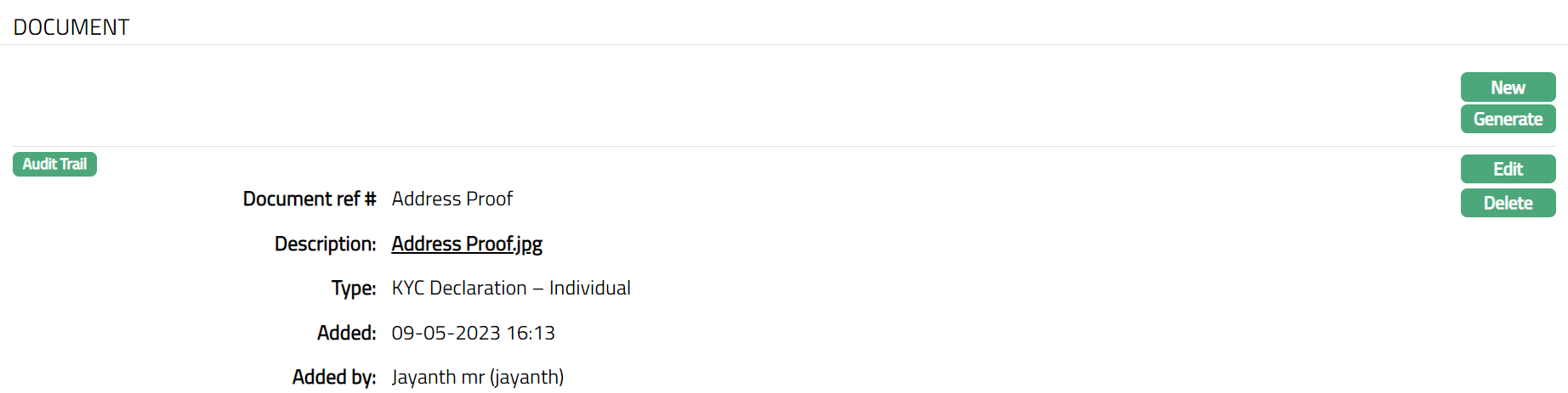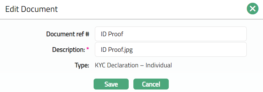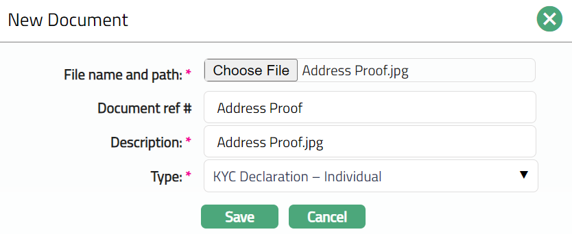 Select Type of the document uploaded. The document types should have been maintained using Admin > System codes > Documents > Document types. Once entered, this cannot be edited.