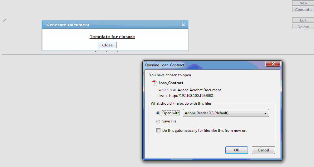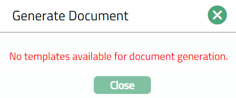 - Click Generate to generate the pdf file using the template as maintained under Admin > System codes > Process > Document templates. You have to map the document template for Client Account using the Document Template Settings tab as maintained under Retail > Settings > Product. Generate Document page will appear where the mapped templates will be displayed.