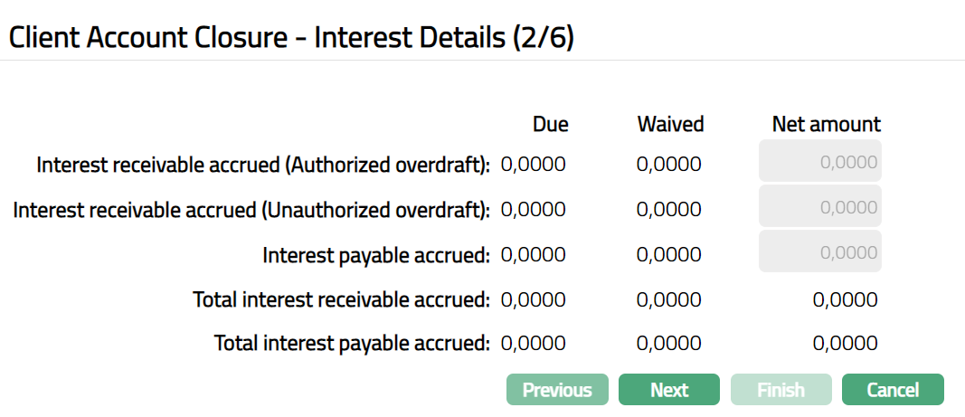 13. Click Next. Client Account Closure -- Interest Details (2/6) page appears.