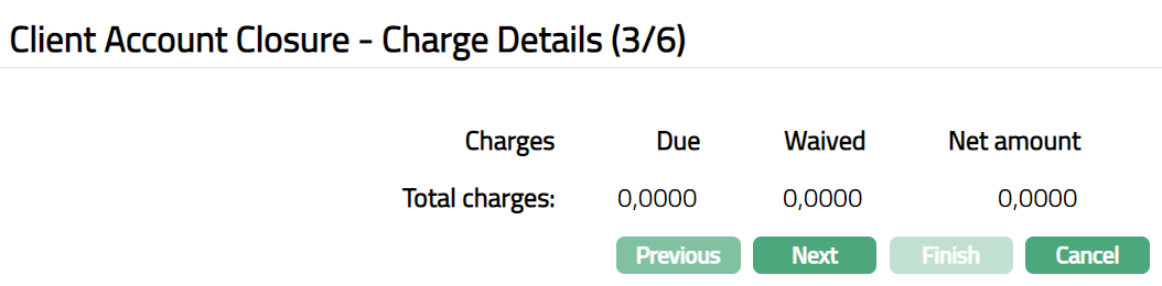 14. Click Next. Client Account Closure -- Charges details (3/6) page appears.