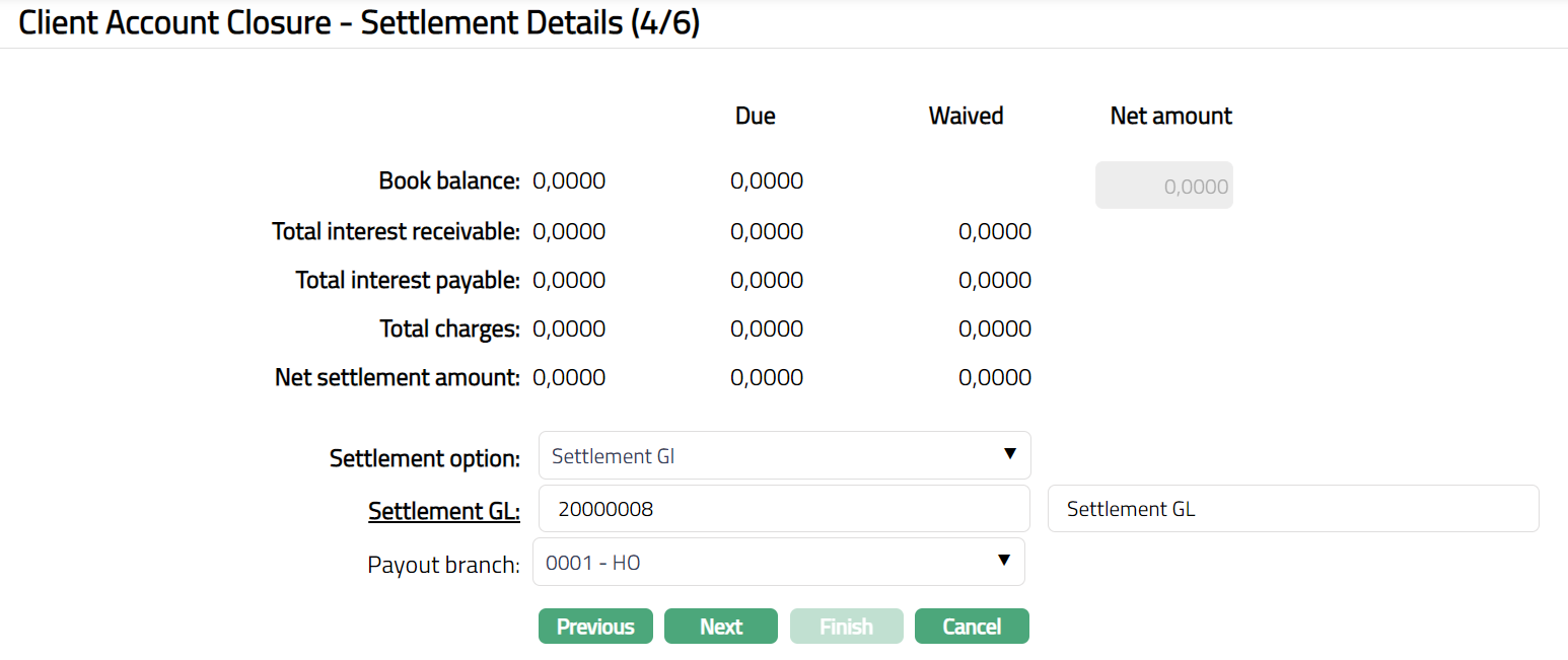 15. Click Next. Client Account Closure -- Settlement Details (4/6) page appears.