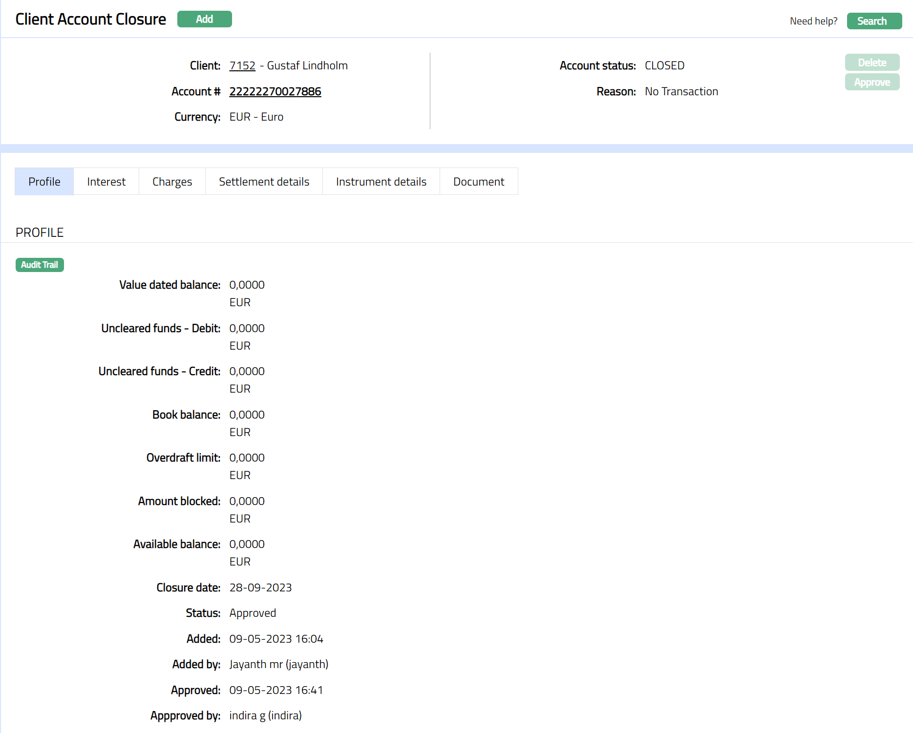 1. From Retail menu, click Accounts, then Client account and then Closure. Client Account Closure Search page appears showing the accounts where closure has been initiated but has not yet been approved.