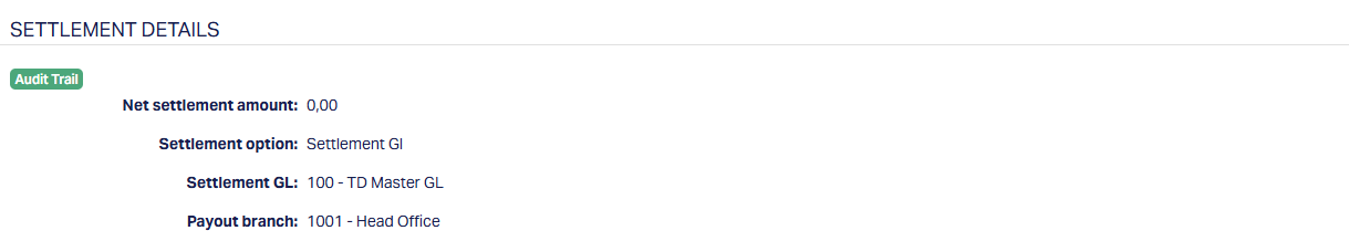 10. To settle the amount using a General Ledger account, Settlement GL has been selected for Settlement option. This is by default and cannot be changed.