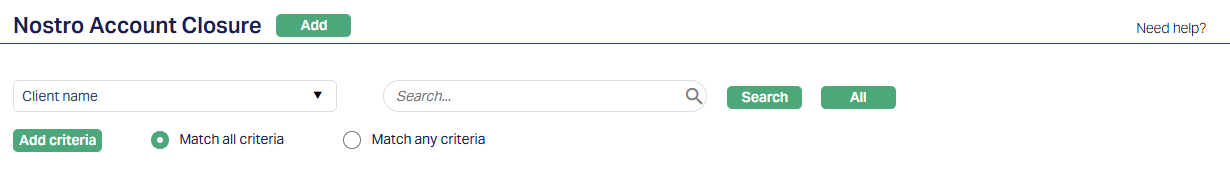 The Nostro Account Closure module allows users to search for, select and close an existing Nostro account held in a foreign bank.