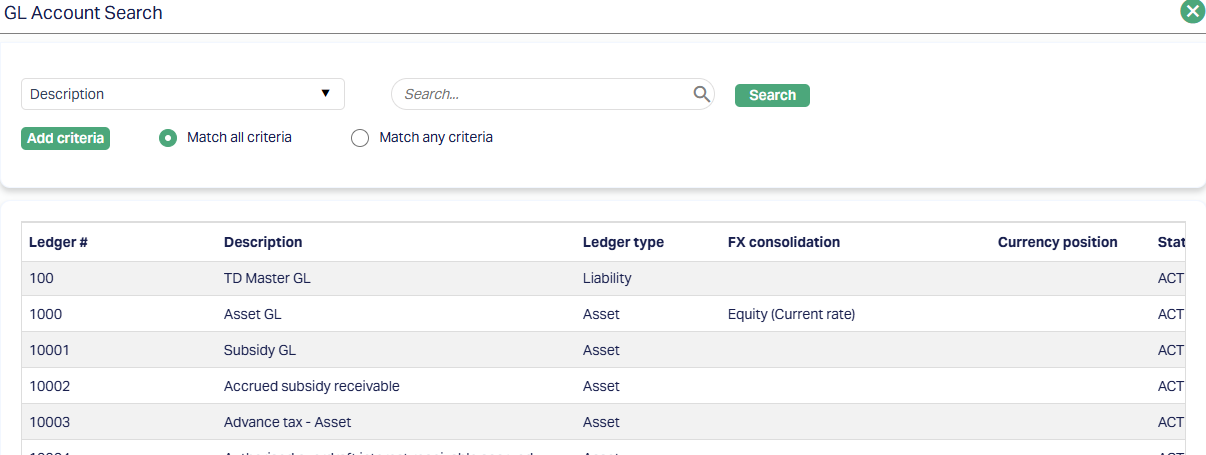 11. Click on Settlement GL hyperlink. The GL Account Search page appears where you can search for a ledger account with relevant criteria maintained at General ledger > General ledger > Accounts and select the required Ledger type and description. Alternatively, you can type in the name of the GL or GL number and choose the relevant GL from the list suggested by Aura (Please refer to the sample screenshot shown below)
