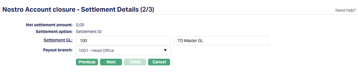 8. Click Next. Nostro Account closure -- Settlement Details (2/3) page appears.