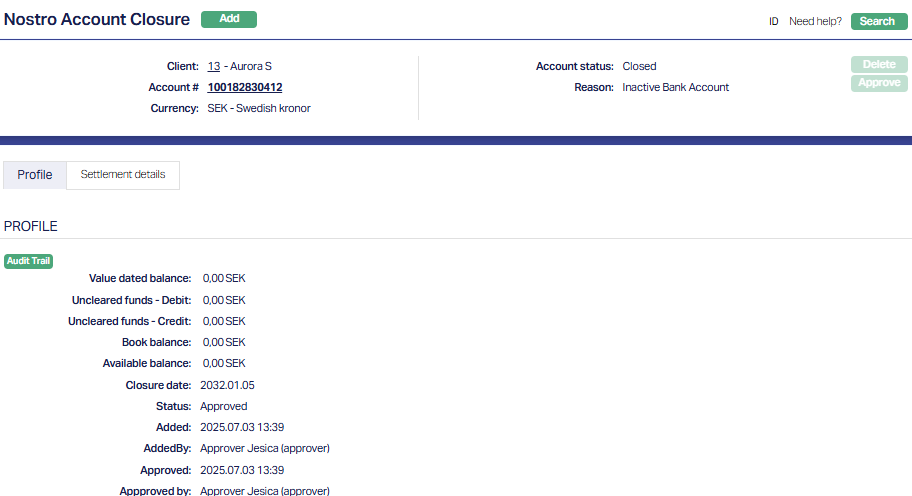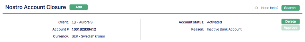 Once the Closure is approved, the account is closed and the Account Status is changed from Activated to Closed. Once closed, the account becomes non-operational and will no longer appear in active Nostro account lists.