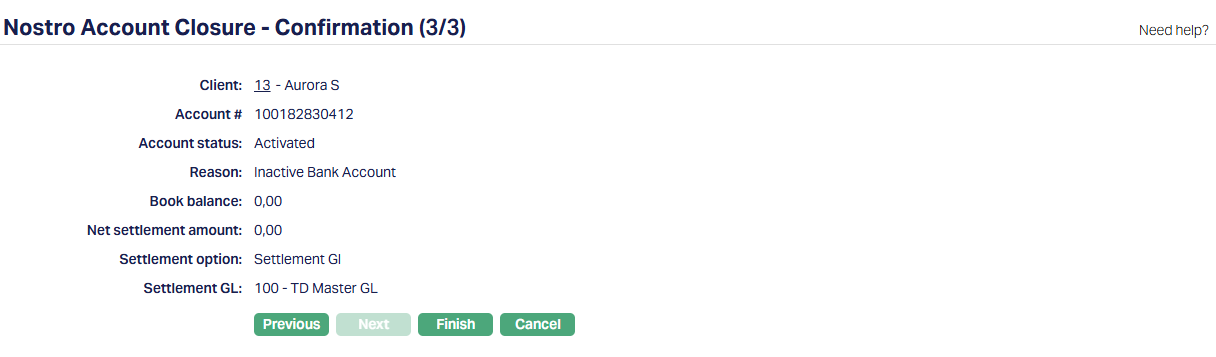 13. Click Next. Nostro Account Closure -- Confirmation (3/3) page appears.