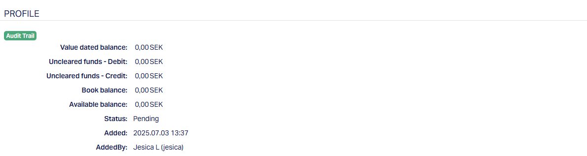 Access Nostro Account Closure page and click Profile tab to view the details as per sample below. The details are defaulted from the entries that you made in Nostro Account Closure -- Client Details (1/3) during account closure creation.