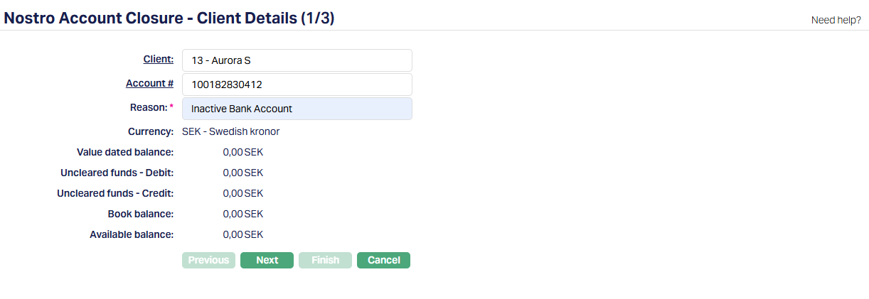 14. Click Finish. Nostro Account Closure page appears.