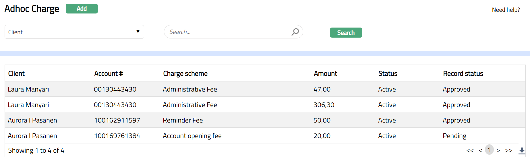On click of Finish, an Adhoc charge is created, and the status will be Active and record status will be Pending. If the Auto Approve Setting is marked as Yes then, the charge status will be Active and the record status will be Approved.