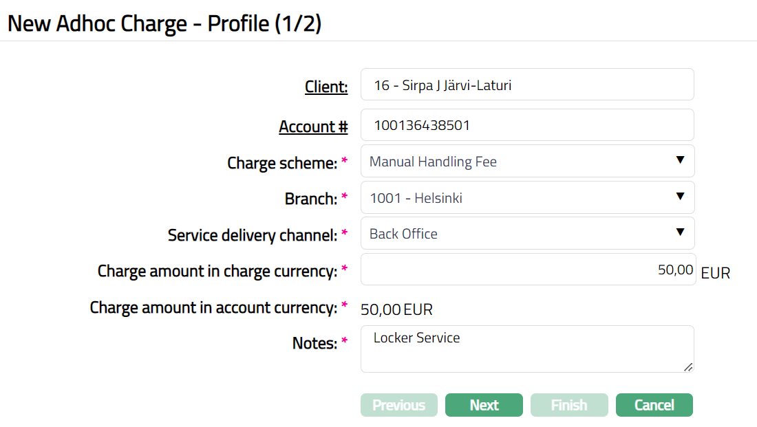 Click Add. The New Adhoc Charge -- Profile (1/2) page will be displayed.