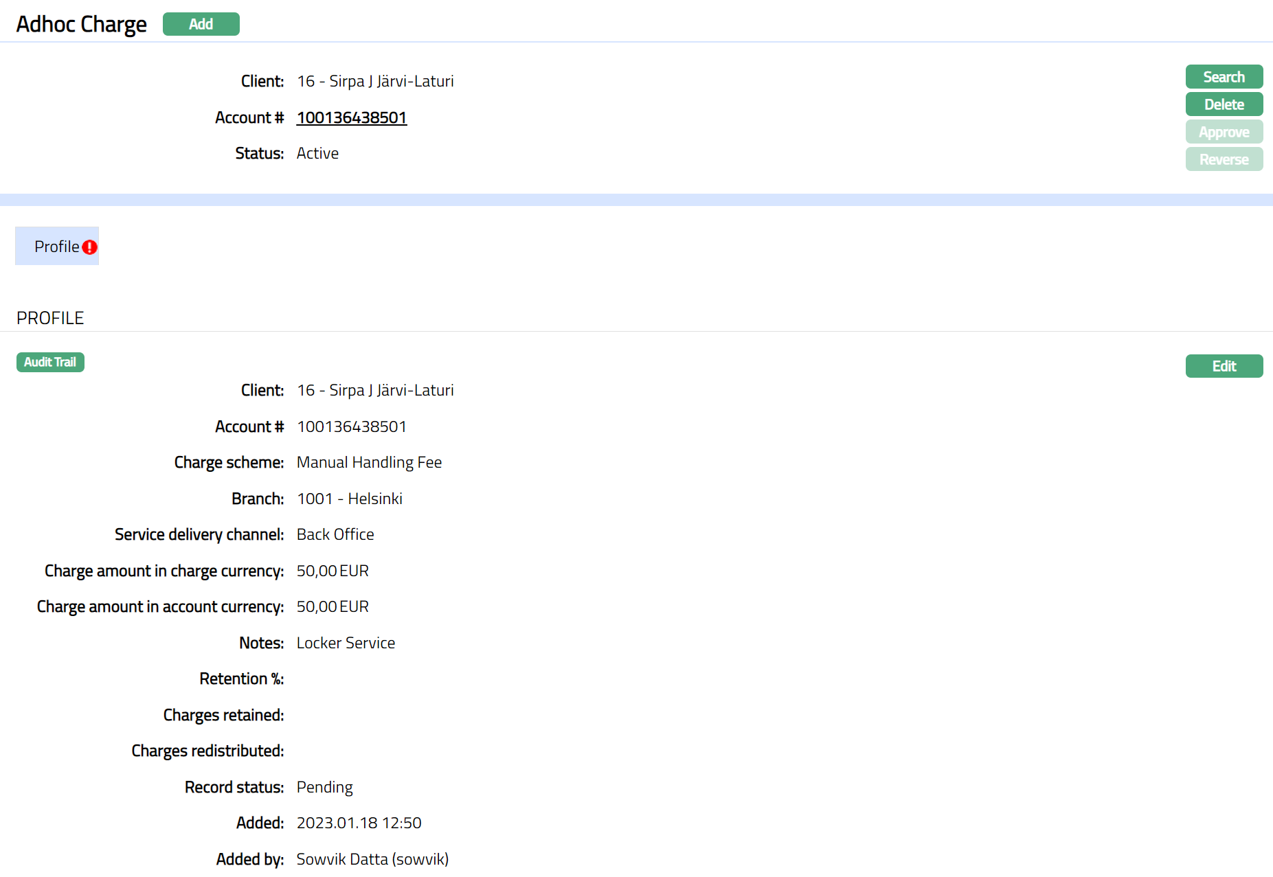 The Profile tab, which is the default tab in the Adhoc Charge screen, shows the basic details of the Adhoc charges.