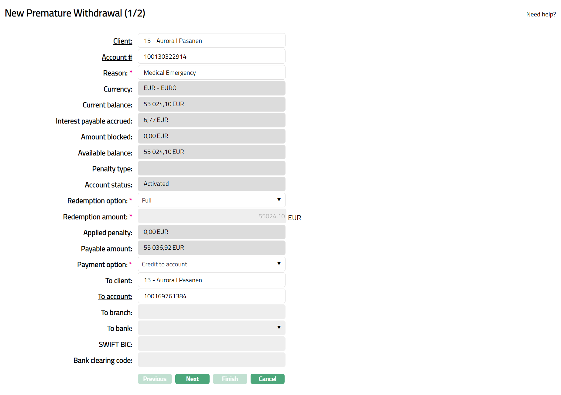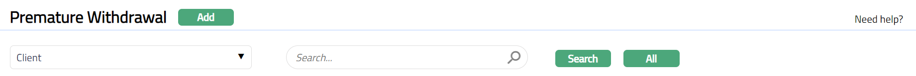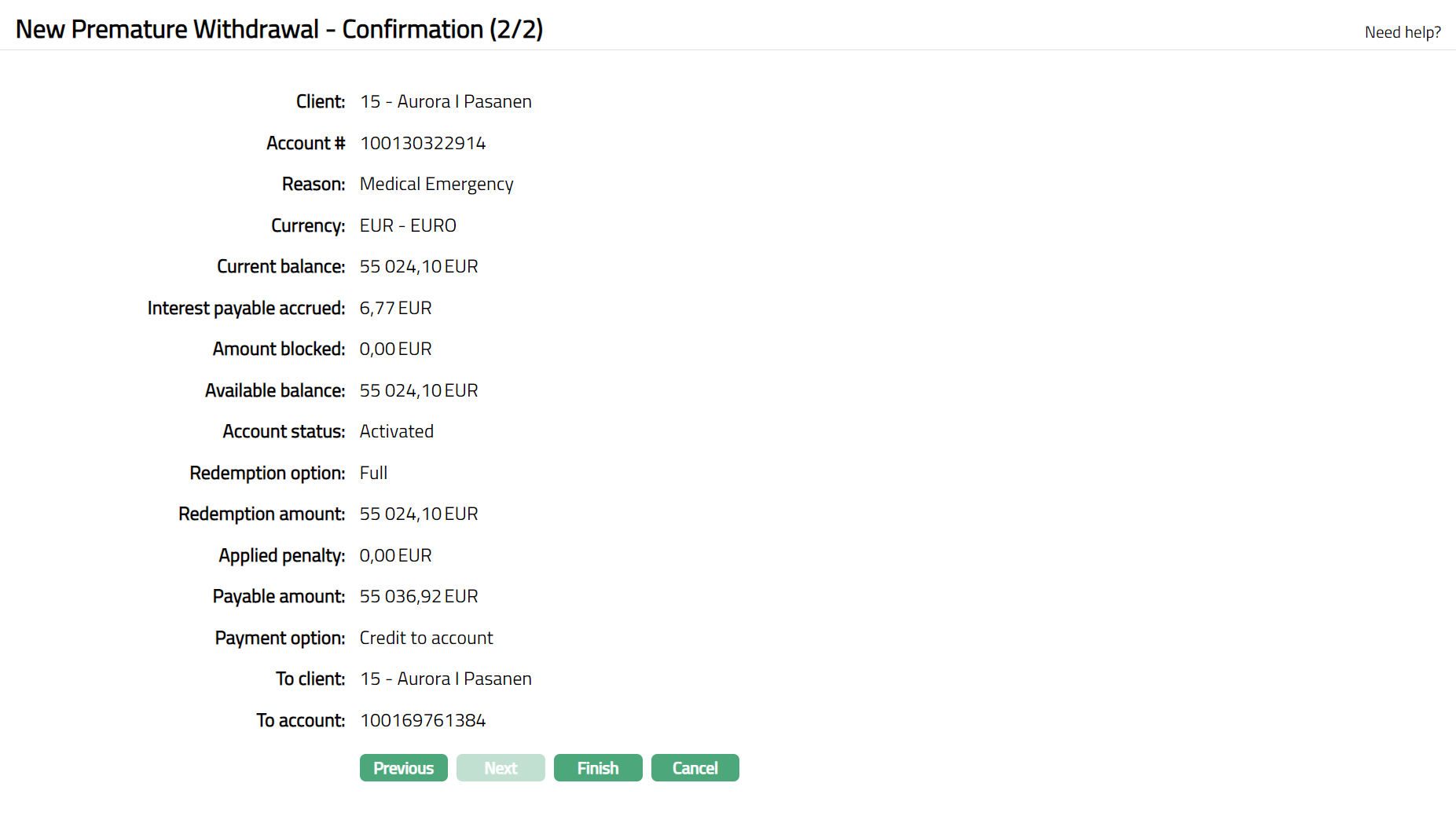- Click Finish. Premature Withdrawal page appears with the added details.