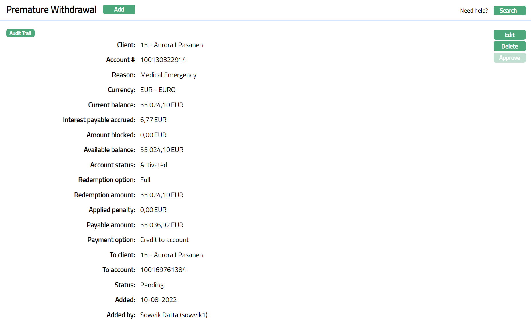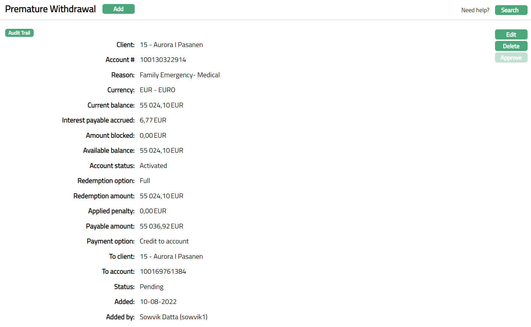 Once edited the status of the premature withdrawal is Pending till it is approved by another user. The user who created the record can edit it any number of times, till it is approved. In this status, Aura disables all the buttons of all the tabs for that particular TD account and only view is enabled.