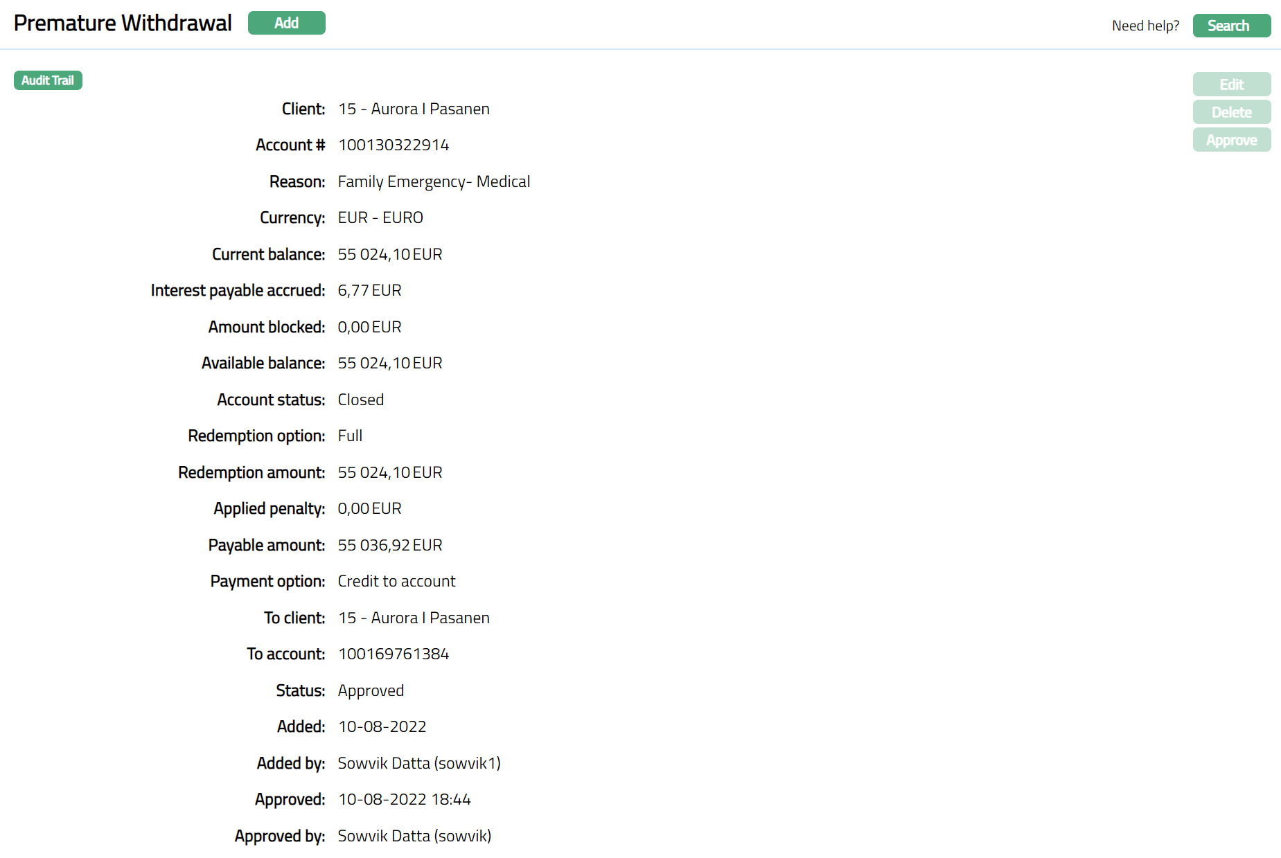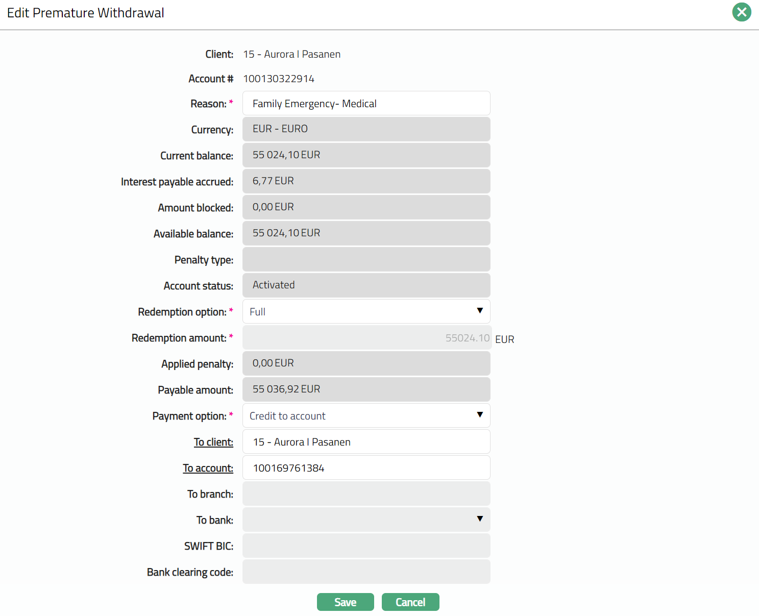 - Click Save. Premature Withdrawal screen appears with the edited details.