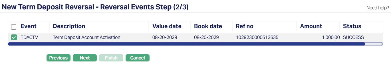 6. Click Next. The New Term Deposit Reversal -- Reversal Events Step (2/3) page appears. All the events that are eligible for reversal for the selected account will be displayed here.