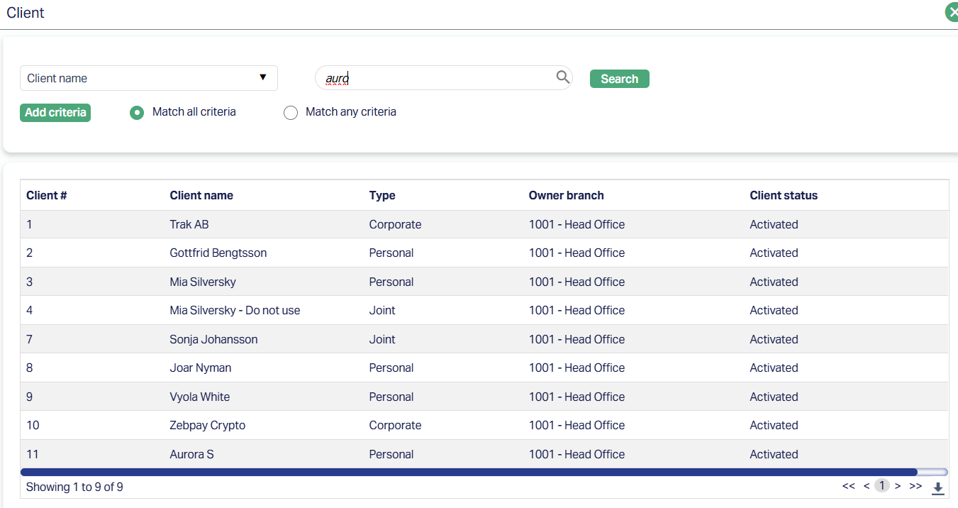 3. Click on Client hyperlink to select the client from the list of clients maintained under CRM > Clients > Maintain. You can search for a client with relevant criteria and select the required client. Alternatively, you can type in the name of the client and choose the relevant client from the list suggested by Aura.