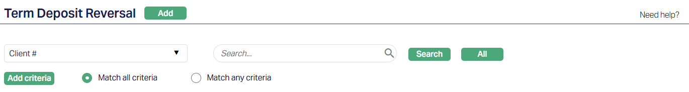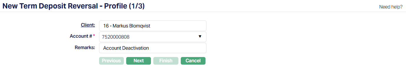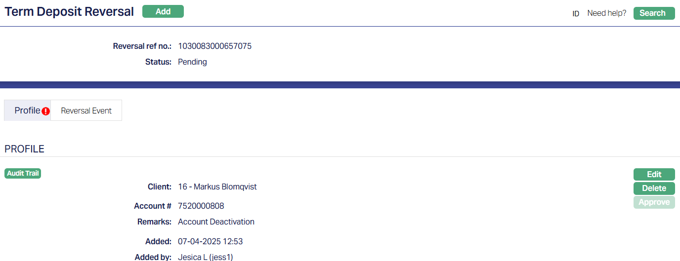 2. Click Add. New Term Deposit Reversal -- Profile (1/3) page appears.