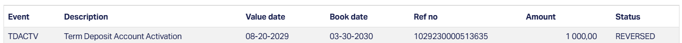 | TDACTV | TDRVAC | Term Deposit Activation | On successful reversal of TDACTV event, Aura will populate TDRVAC event with TDACTV event value date and reversal date as event booking date. |