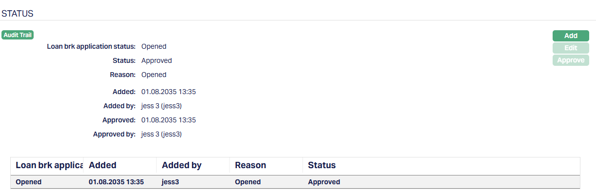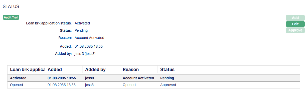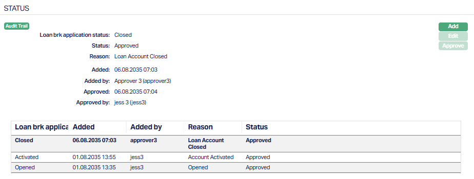 After the status is set to Closed, you can add a new status using the Add button. This allows the loan application to be activated again.