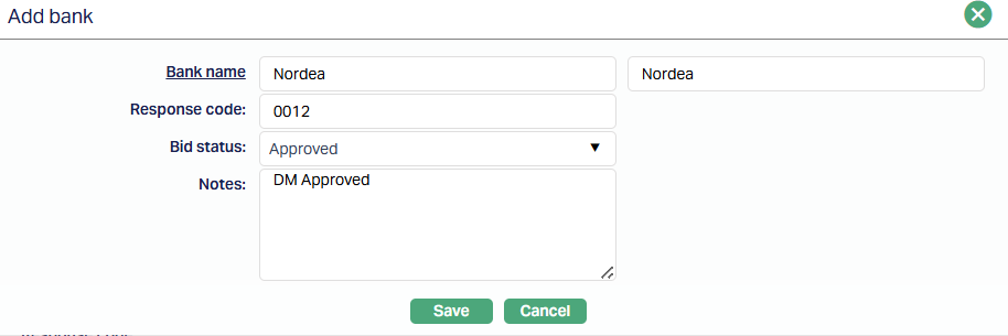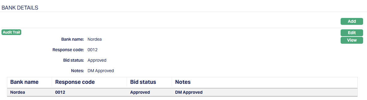 Note: You can add multiple bank records for a single loan application broker. Each record represents a response from a bank. All added records are displayed in the Bank Details section, where you can view and edit individual entries.