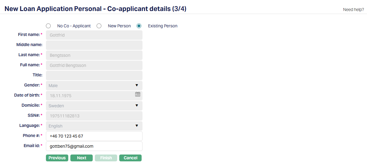 When you select an Existing Person, Aura retrieves and displays the co-applicant details from the selected record.