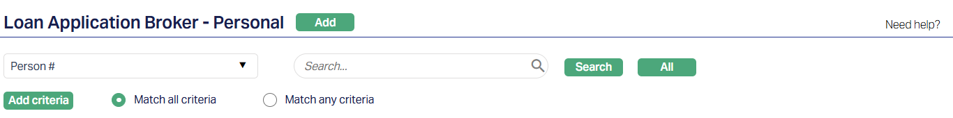 1. From the Retail menu, click Loan Broker and then on Maintain. The Loan Application Broker → Personal page appears. From this screen, you can search for existing Loan Application Broker or create a new application.