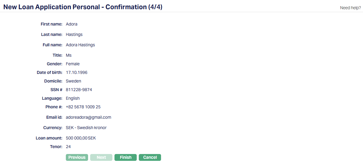 27. Click Next. The New Loan Application → Confirmation (4/4) page appears.