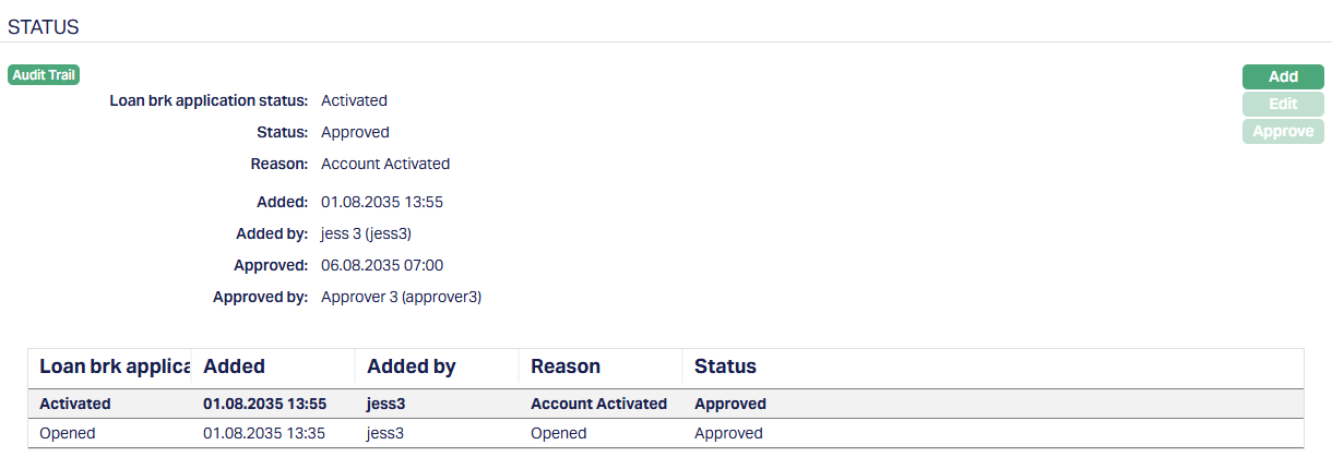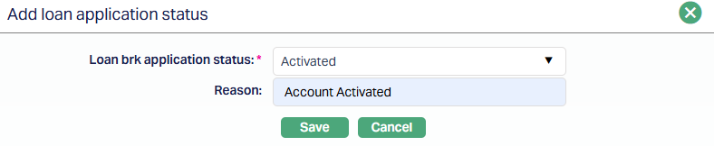Activated - This status indicates that the loan application is active and has progressed beyond the initial stage. You can assign this status manually. Once added, the status must be approved by another user to become effective.