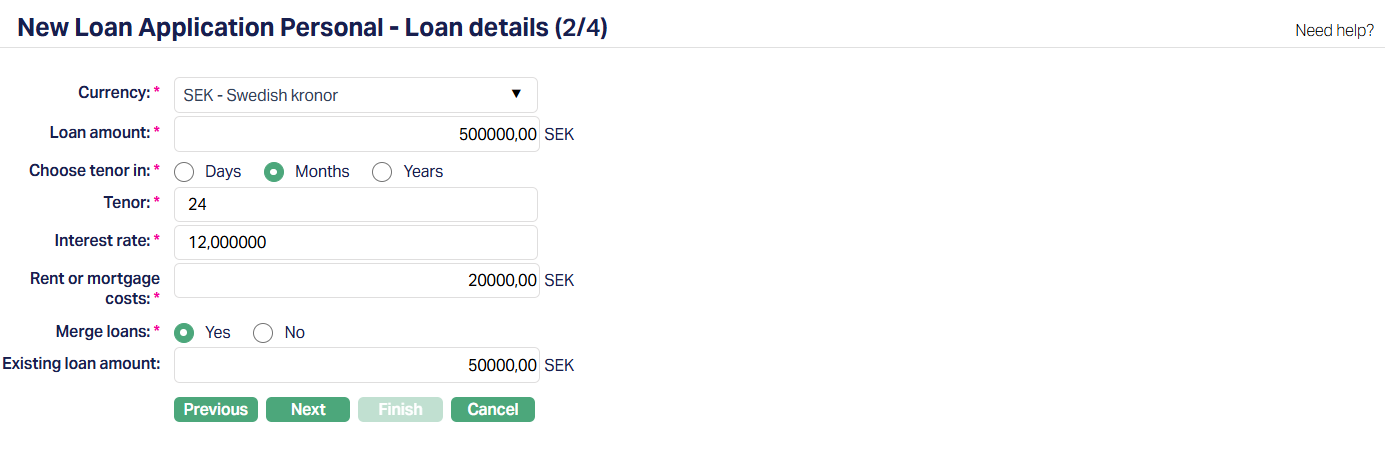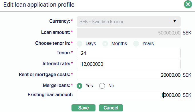 Note: All fields are editable except Currency, Loan amount and Choose tenor in fields.