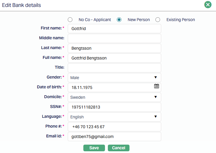 If you select Existing Person, Aura allows you to select a person already maintained in Aura, and the details are populated automatically.