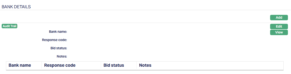 The Bank Details tab allows you to associate banks with the loan application, capture their responses, and manage the status of each bank's offer.