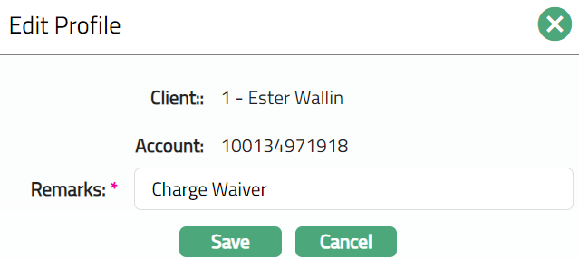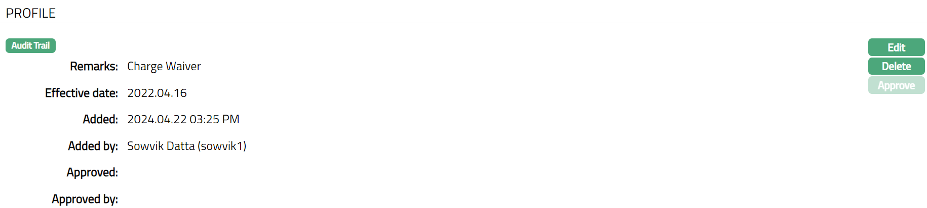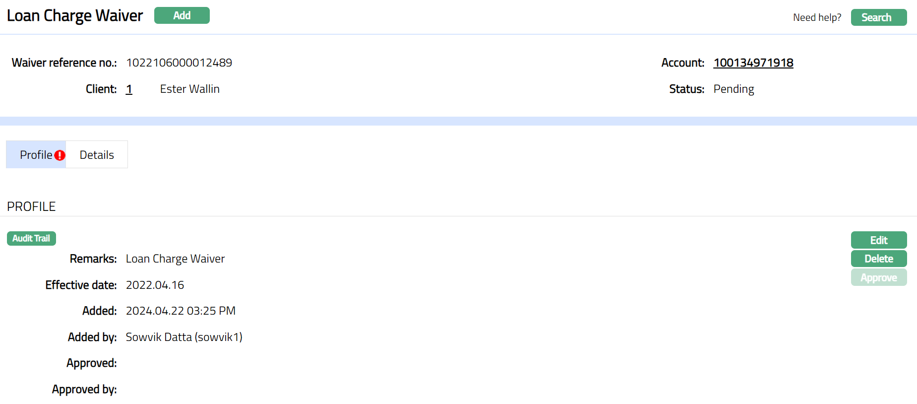Note: On creation of the Loan Charge Waiver, the record Status will be Pending. Only on approval, the Loan Charge Waiver will be Approved.