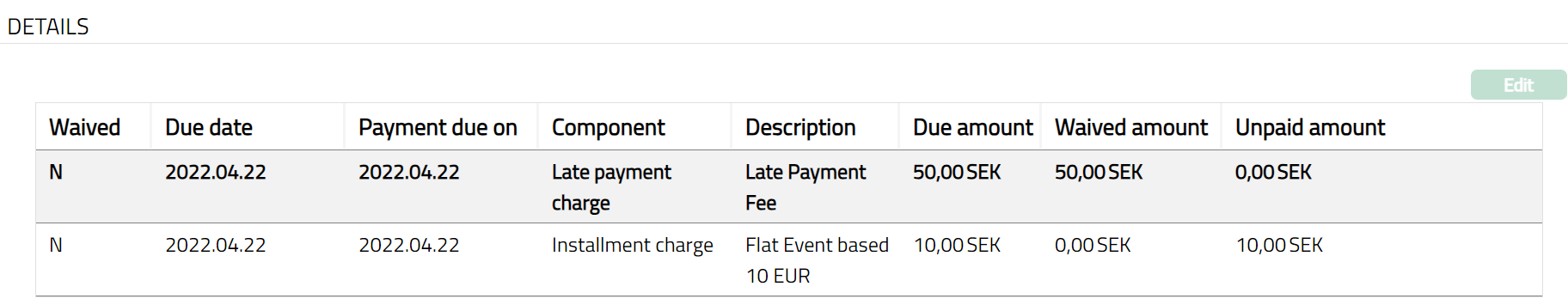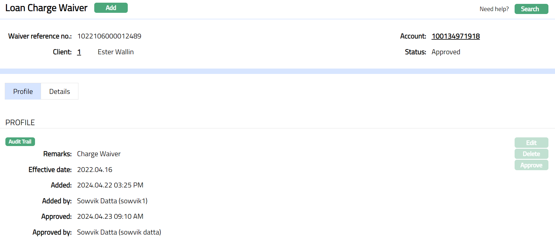Details tab shows the details of the Loan Charge Waiver added in New Loan Charge Waiver - Details (2/3).