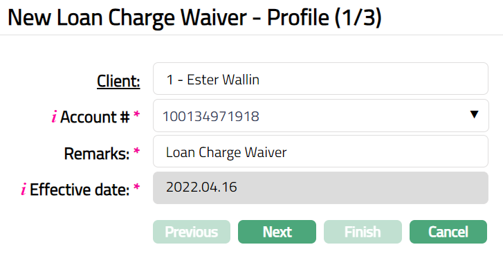 - Click Add. New Loan Charge Waiver-Profile (1/3) page appears.