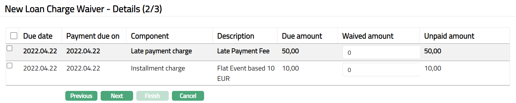 - Access Loan Charge Waiver page and click Details tab. It will display all the details defaulted from New Loan Charge Waiver - Details (2/3). screen.