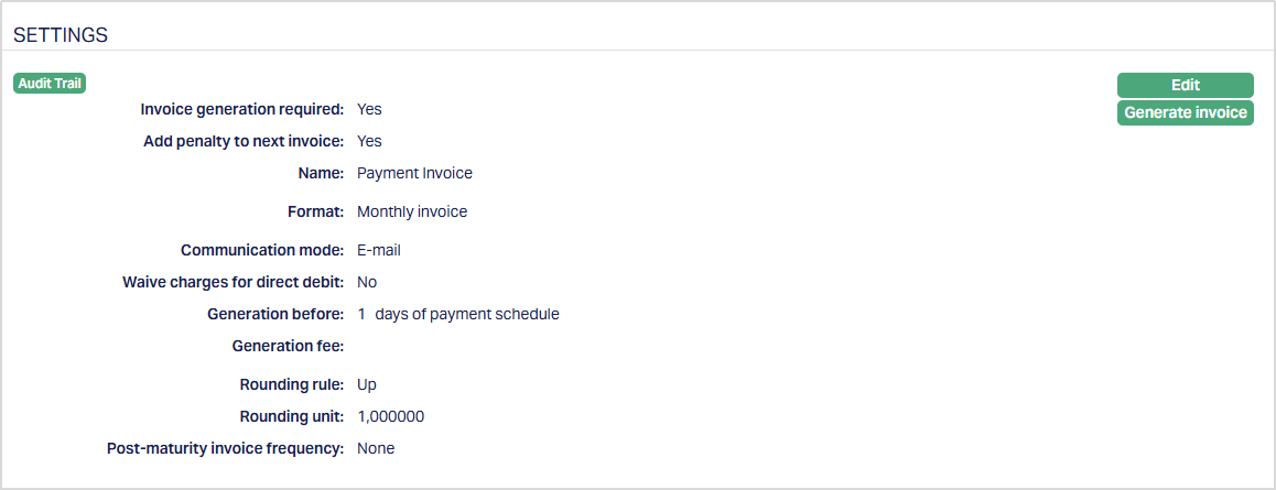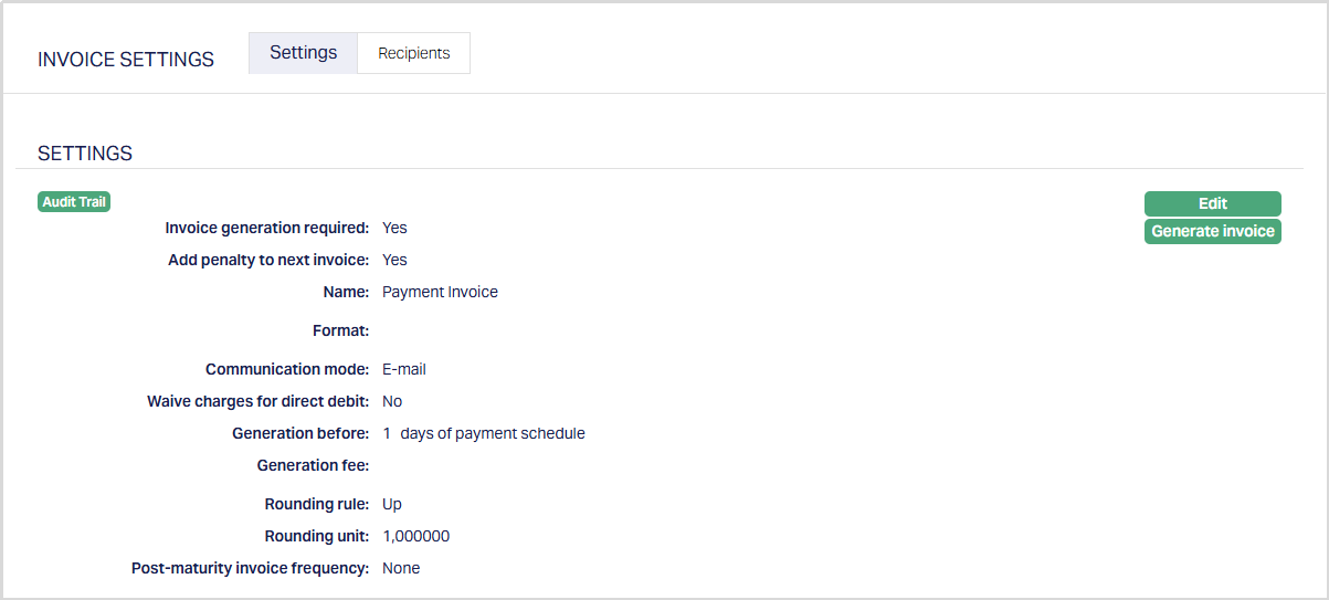 Payment Settings tab allows you to view the payment settings details like Principal / Interest / Annuity/Amortized Payment Frequency, First Interest Payment Date.