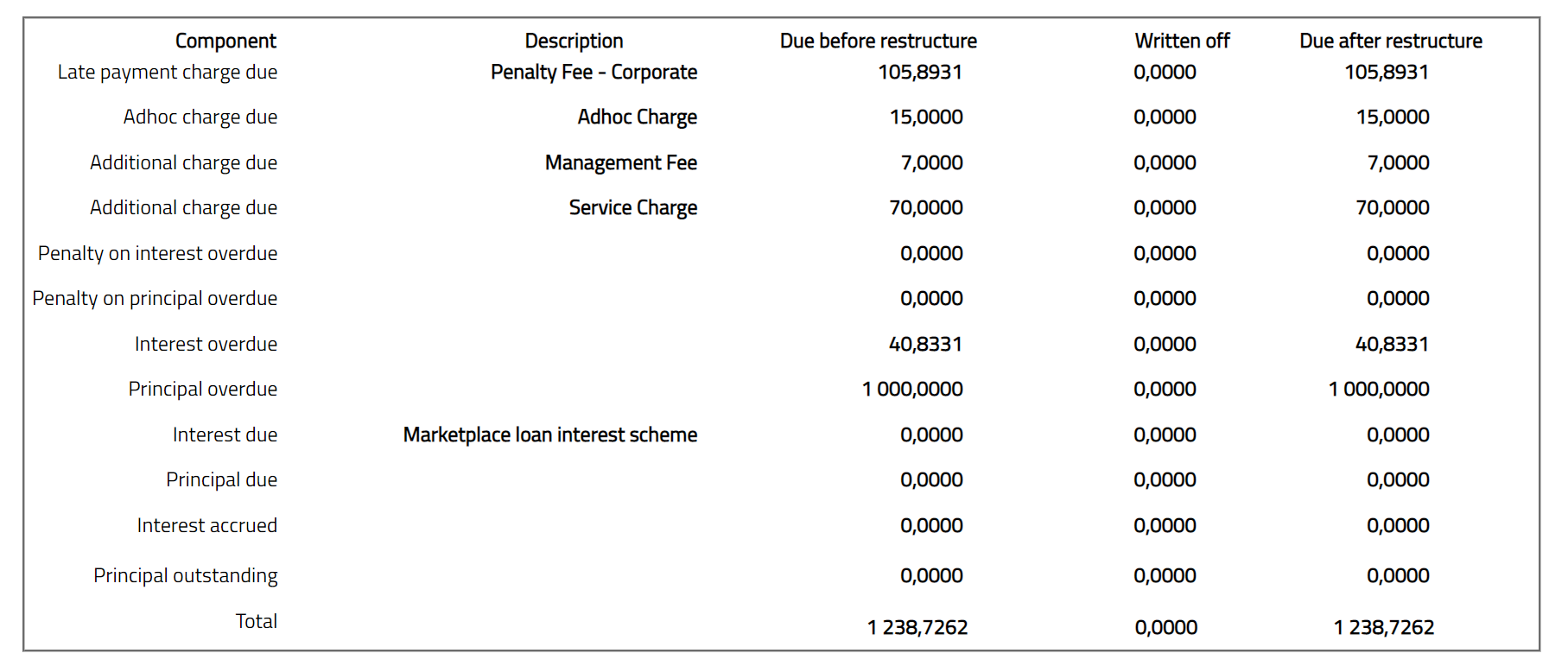 - The available fields in the table are Component, Despription, Due before restructure, Written off and Due after restructure. Note: You cannot add / edit this tab.