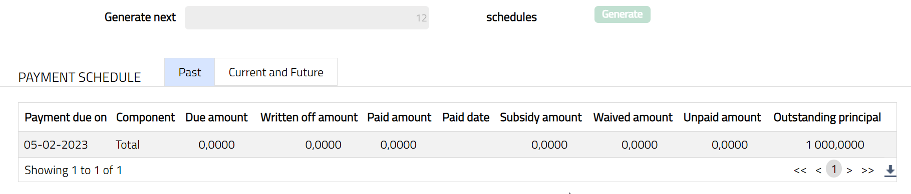 - Click Payment Schedule tab. There are two sub-tabs within it -- Past, Current and Future. By default, the Current and Future tab is displayed. It shows the details of the Payment Schedules that have Payment due on and Paid date.