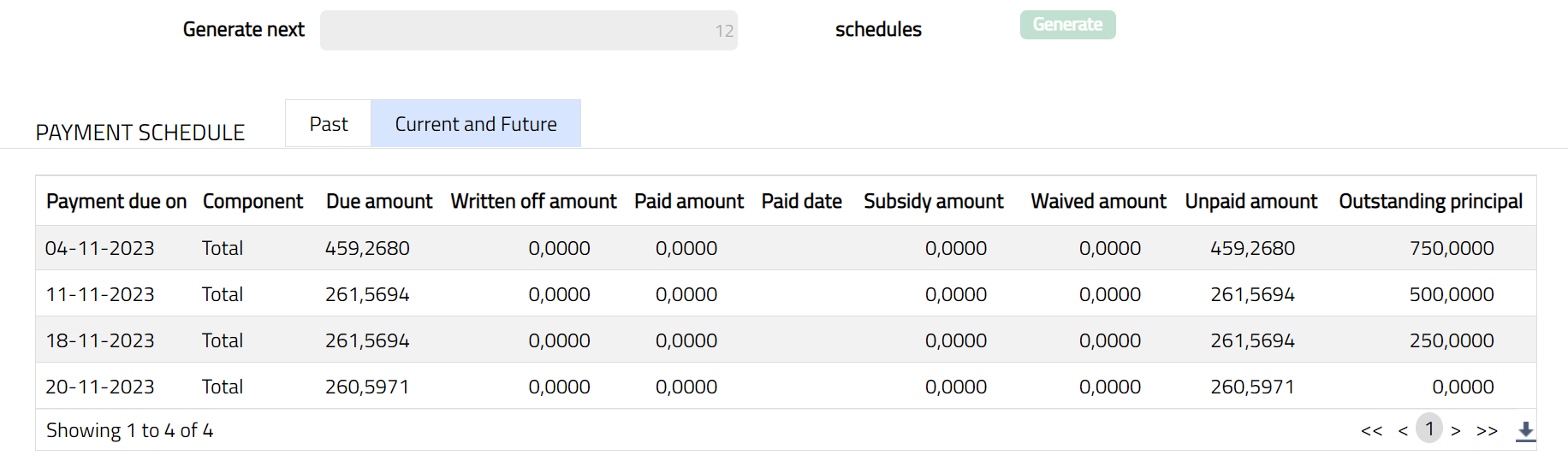 Outstanding principal: Indicates the total outstanding amount for the payment schedule.