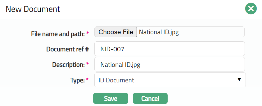Select Type of the Document uploaded. The document types should have been maintained using Admin > System codes > Documents > Document types. Once entered, this cannot be edited.