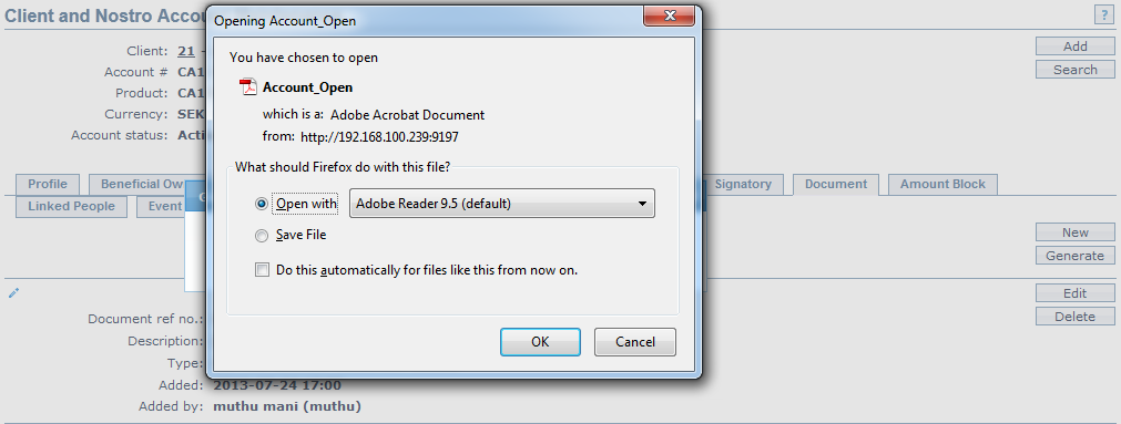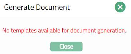 - Click Generate to generate the pdf file using the template if maintained under Admin > System codes > Process > Document templates. You have to map the document template for Nostro account product under Document template settings as maintained under Retail > Settings > Product. New Document page will appear where the mapped templates will be displayed.