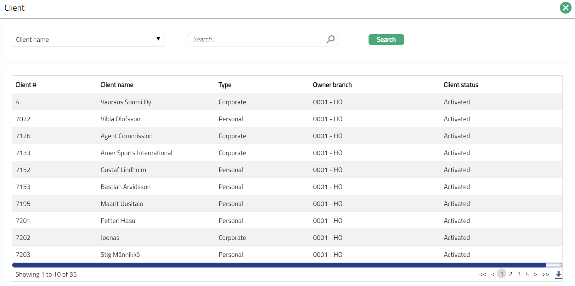 Select Client by clicking on client hyperlink. The Client search page appears where you can search for a client with relevant criteria and select the required client. You can also input the client's name and select the required client from the list displayed by Aura. The Client search page appears with the list of Active Corporate clients maintained at CRM > Clients > Maintain. Please refer to the Sample Screen shot shown above.