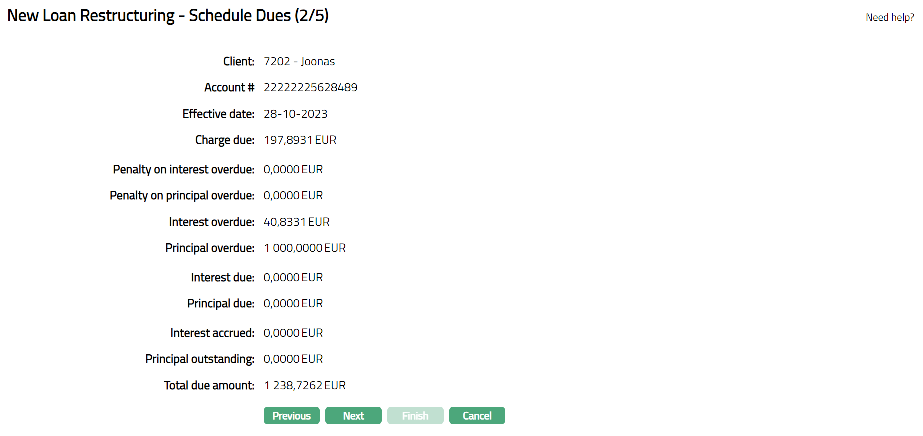 Note: The details are defaulted based on the client and account # selected. You can edit the required details if required under Due after restructuring.